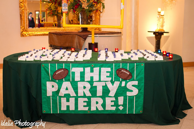 What do newlyweds Anastasia and Christian have in common with the NY Giants?!  Well, that they all had the most unforgettable and amazing weekend ever!  Their wedding day was scheduled for the day before Super Bowl Sunday, so when the Giants made it into the playoffs they felt confident that their favorite team would make it all the way to the Super Bowl.  The bride showed her Giants team spirit by wearing blue shoes under her gown, choosing blue for her bridesmaids, purchasing football purses for all the girls, and even sporting a Giants helmet at the reception!  Check out how this fabulous couple took the football theme and ran with it!