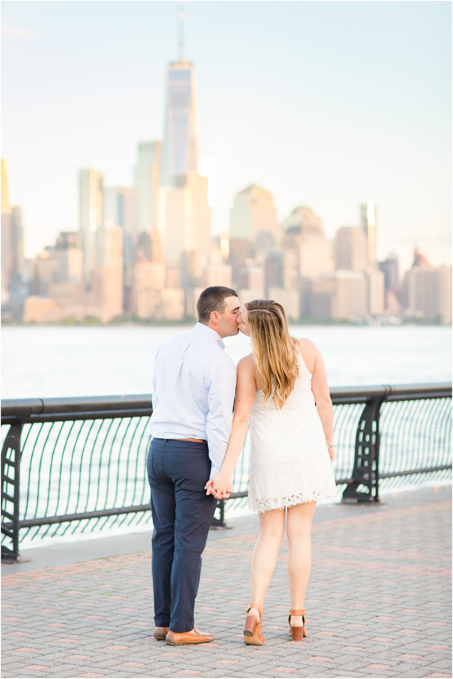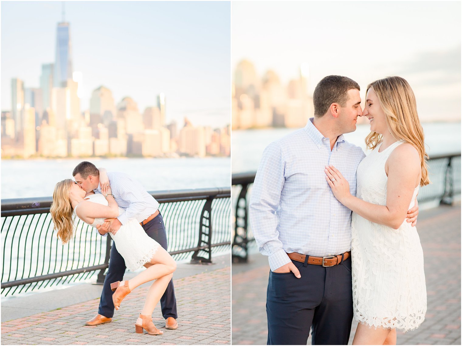 For their engagement session, I headed up to Hoboken. We started the session out at their favorite neighborhood spot where they love to walk their dog, Moses. I had never been to this area of Hoboken and it ended up being perfect! I love the cobblestones, light-colored buildings, and welcoming vibe of this spot. Plus Trish and Mike were so at ease with each other; they warmed up to the camera right away with their genuine laughter and excitement over being engaged. I have to say that I really loved meeting their dog Moses, too. {He was so well-behaved! A big thank you to Trish’s Man of Honor for coming to assist with Moses!!) For the second half of their session, we went down to the Hoboken waterfront and had a perfect ending to our time together. Enjoy getting to know these two as they await their June 2019 wedding!
