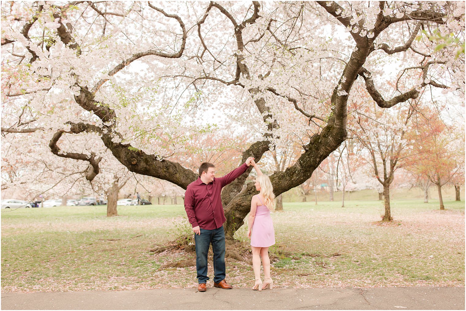 Amanda and Sean were engaged last August after an epic proposal at a castle. Yup! More on that in Amanda’s own words below, but first let me tell you about their cherry blossom engagement session! Amanda and Sean wanted an engagement session with the cherry blossoms so we planned to do it in mid-April when these gorgeous trees would be blooming. The cherry blossoms bloom and peak for a very short window each year so I always have to keep a close eye on them each spring. It’s so worth it, though, because they are just beautiful and so dreamy. They make the perfect backdrop for a spring engagement session.