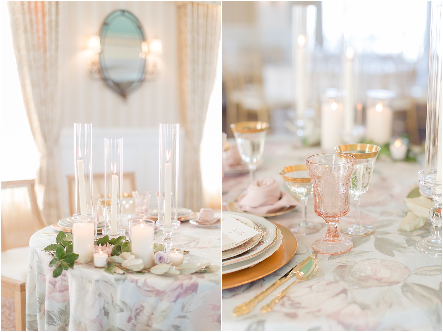 When Jeanne reached out and shared the inspiration with me for this Mallard Island Yacht Club wedding, I was totally on board. She chose a beautiful palette featuring lots of pastels – pinks and blue-greens especially – paired with traditional ivory and gold details. Mallard Island Yacht Club has a lot of ivory and grey that’s found throughout the venue and the ballroom has a fun pop of robin blue. The summer palette that was chosen was perfect for this space. Not to mention, all of the blues from the water around LBI helped tie everything together, too! I started the styled shoot much like I start wedding days – with our beautiful bride in the getting ready suite. Mallard Island Yacht Club’s bridal suite is over the top. With a stunning bed and space for the bride to rest, it was the best possible way to begin our day onsite. Alexa wore two different gowns throughout our styled shoot. One was more sleek and chic. The other had a fun textured skirt that trailed behind her. Both were great to photograph and play in!