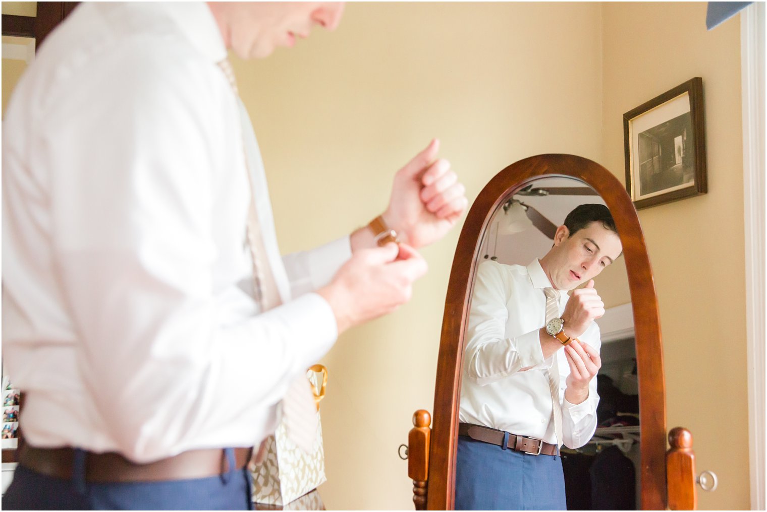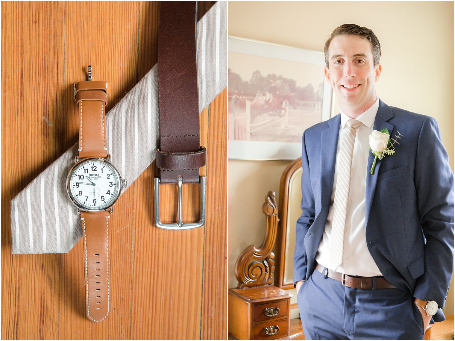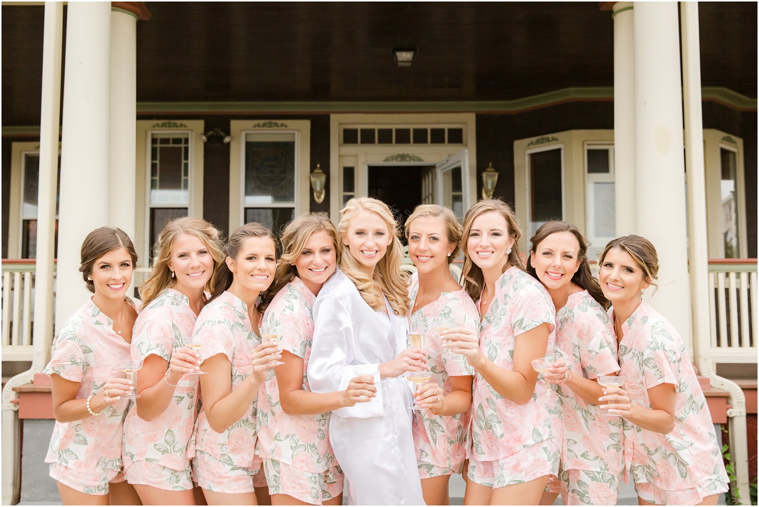 Last Saturday, we had the pleasure of documenting Megan and Tyler’s wedding day! We met these two college sweethearts thanks to Megan’s brother who was a groomsman in a wedding we captured a couple of years ago. We are always so thankful when our couples refer us to their friends and to their friends’ younger siblings! Megan started the day out in Ocean Grove in the prettiest Victorian house right across the street from the ocean. It was the perfect place for her to spend the morning getting ready with her bridesmaids and we couldn’t have asked for a nicer setting for her getting ready photos. Megan chose a beautiful fit and flare Pronovias dress (that her sister actually found for her!) and it went perfectly with her loose bouquet full of white hydrangeas, quicksand roses, dusty miller, and eucalyptus. While Megan was getting all dolled up with her favorite ladies, Tyler started the day out in Bradley Beach with his groomsmen and family before heading to the church on a classic Long Branch Trolley.