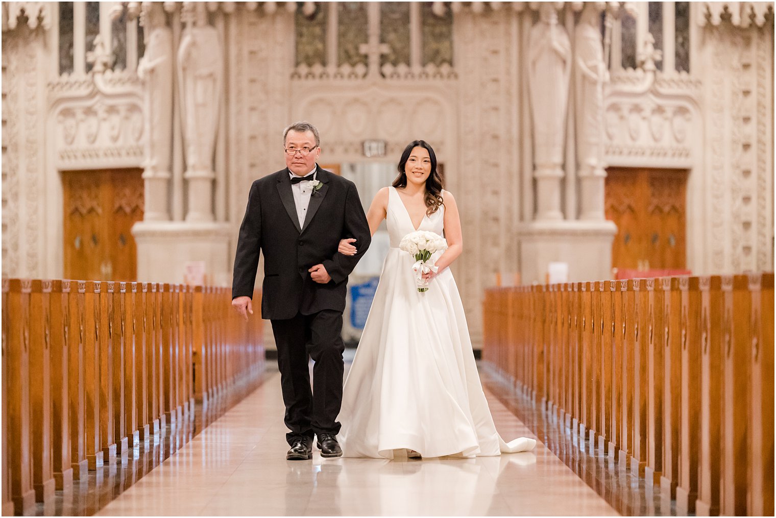 From the beginning, Ashley and Thomas knew that they wanted their day to have a minimal modern feel. With a color palette of black, white, and champagne and lots of orchids, they brought that vibe to life! Ashley and Thomas prepared for their wedding day before meeting at The Cathedral Basilica of the Sacred Heart for their ceremony. They opted for no first look and kept things traditional, which I think worked beautifully in a church like this! While Ashley and Thomas fell in love with the church, the whole search began because both of their mothers wanted them to be married in a church. I think they chose one of the most gorgeous locations in New Jersey!
