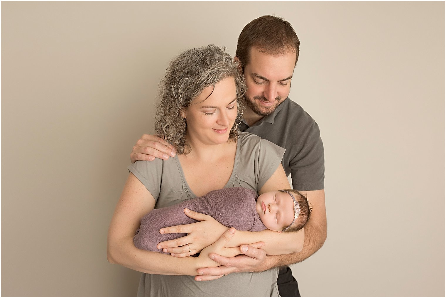 Cordelia, big sister Vivian, and their proud parents came to see me three weeks ago and I’ve been wanting to share these images ever since! I’m always excited to welcome a new family into my little studio, but I was especially looking forward to this one because I couldn’t wait to see the styling come together. Cordelia’s mother and I had discussed creating a collection of images in shades of lavender, purple, and gray, and I quickly realized I had never styled a session in these gorgeous colors! Cordelia’s parents opted for a classic newborn session, which includes twenty images in the final gallery, and they requested family, parent, sibling, and individual baby photos, so I knew there would be lots of variety in their collection. We started out the session with the family photos and Cordelia and four year old sister Vivian were perfectly behaved! I then captured these two beautiful sisters in what are definitely some of my favorite sister photos to date and I could’ve photographed them together all day long, but there were other photos to be taken during the session. Cordelia loved to eat, so we took lots of breaks in between sets in order to keep her happy, and our patience paid off because we ended up with some gorgeous images that I can’t wait to share with you today! I’m also excited to share a sneak peek at a little project I’ve been working on at the end of this post so don’t miss it!