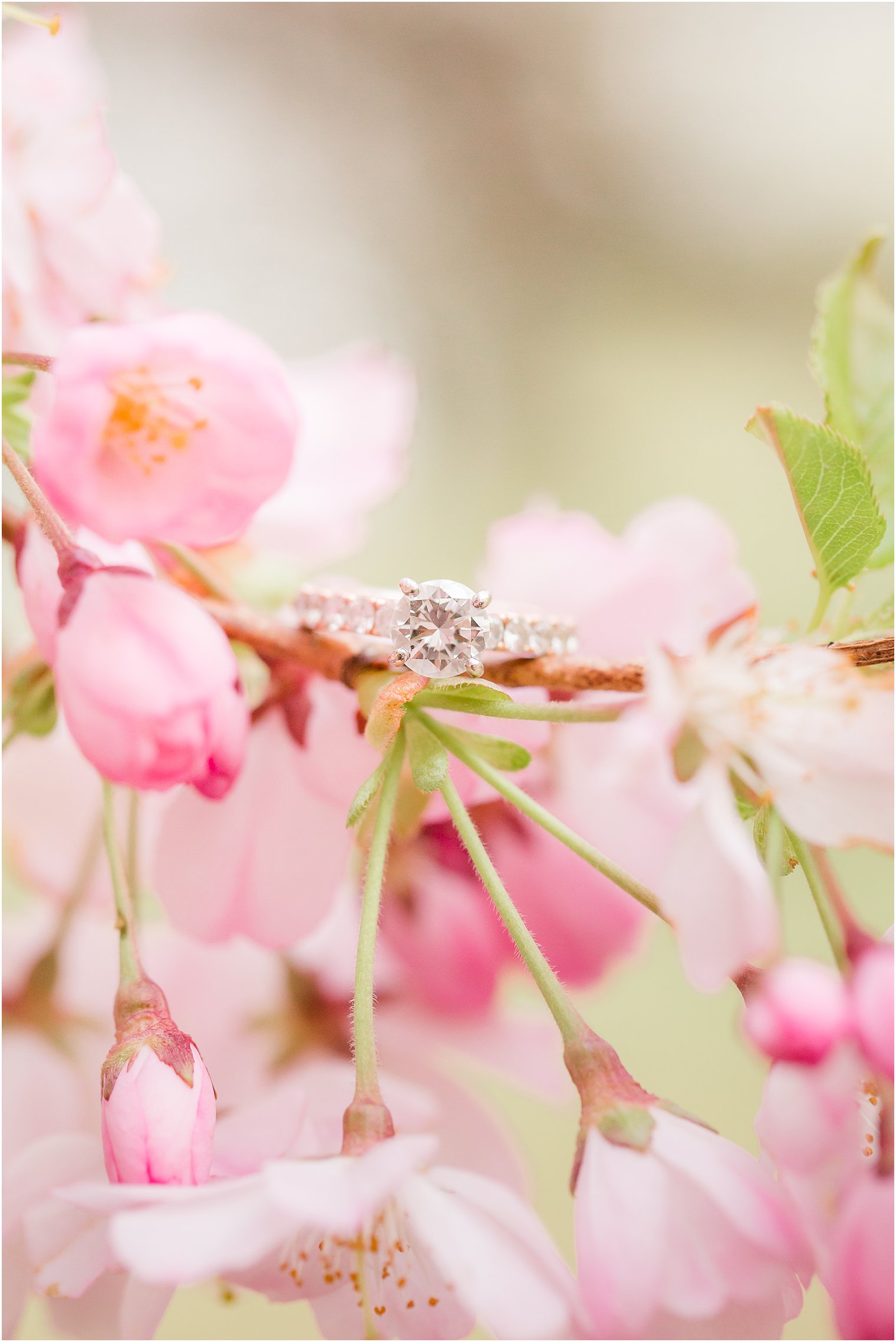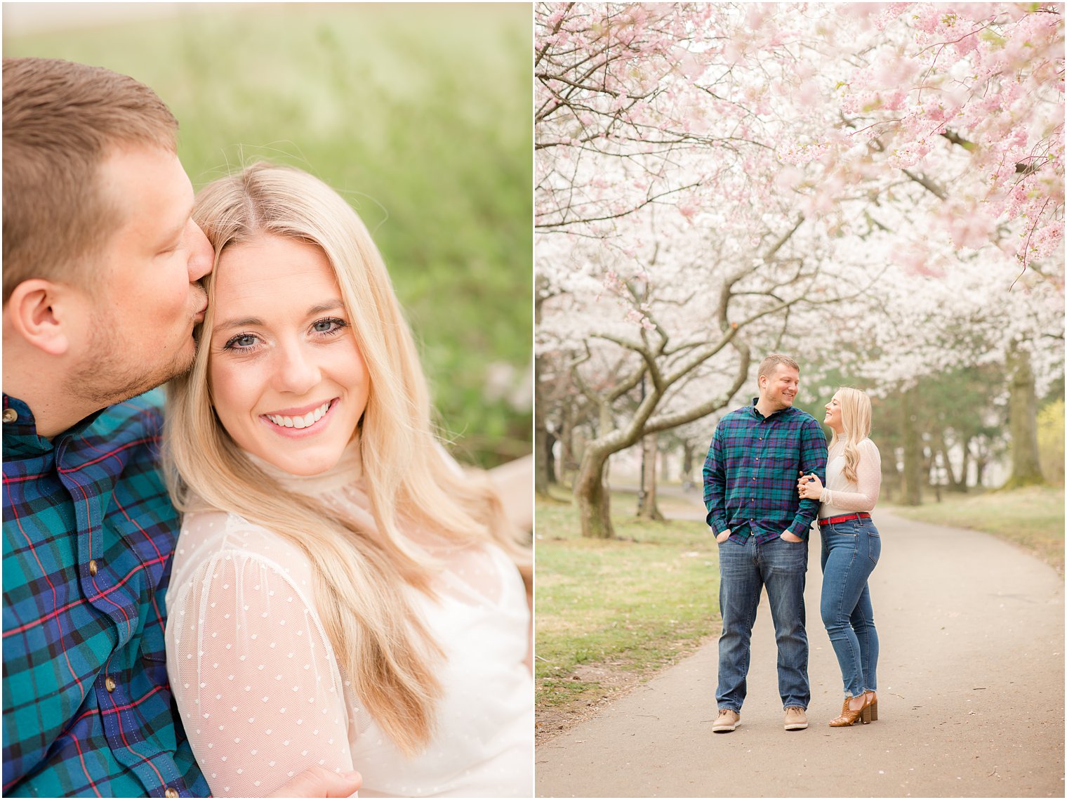 Chelsea and Jeffrey have known each other since elementary school. On the first day of 6th grade, Chelsea was on the bus and there was a new boy being picked up down the road from her house. Little did she know he was going to be in her class that year. A few years later, they had freshman science class together and they sat in the back row of the class and pretty much laughed their way through the entire year. However, it wasn’t until years after high school that they reconnected again through a mutual friend and have been together ever since. Chelsea and Jeffrey shared lots more about their love story and I’m so excited to share all the details below – enjoy reading them as you check out their Spring Cherry Blossom Engagement!
