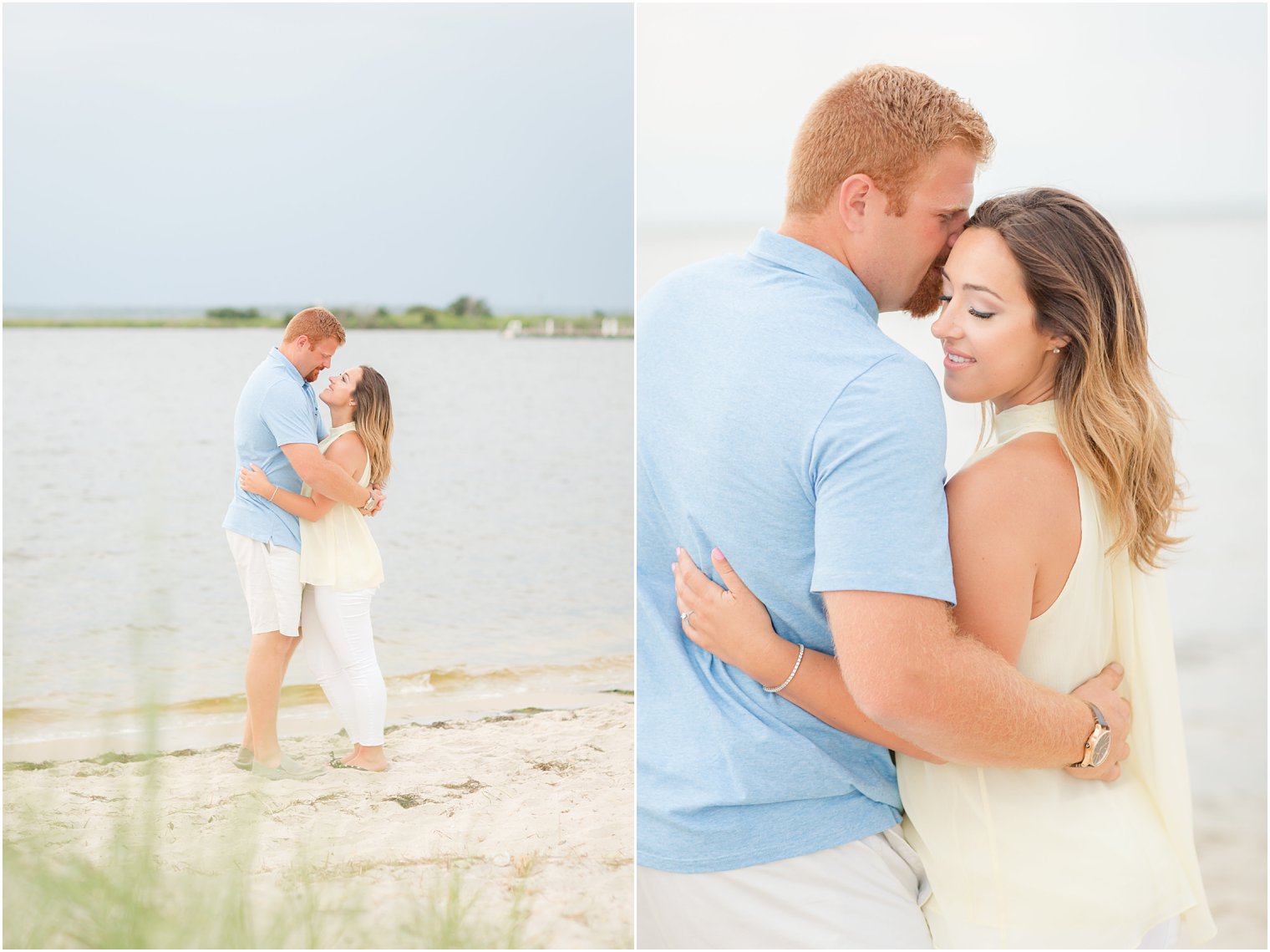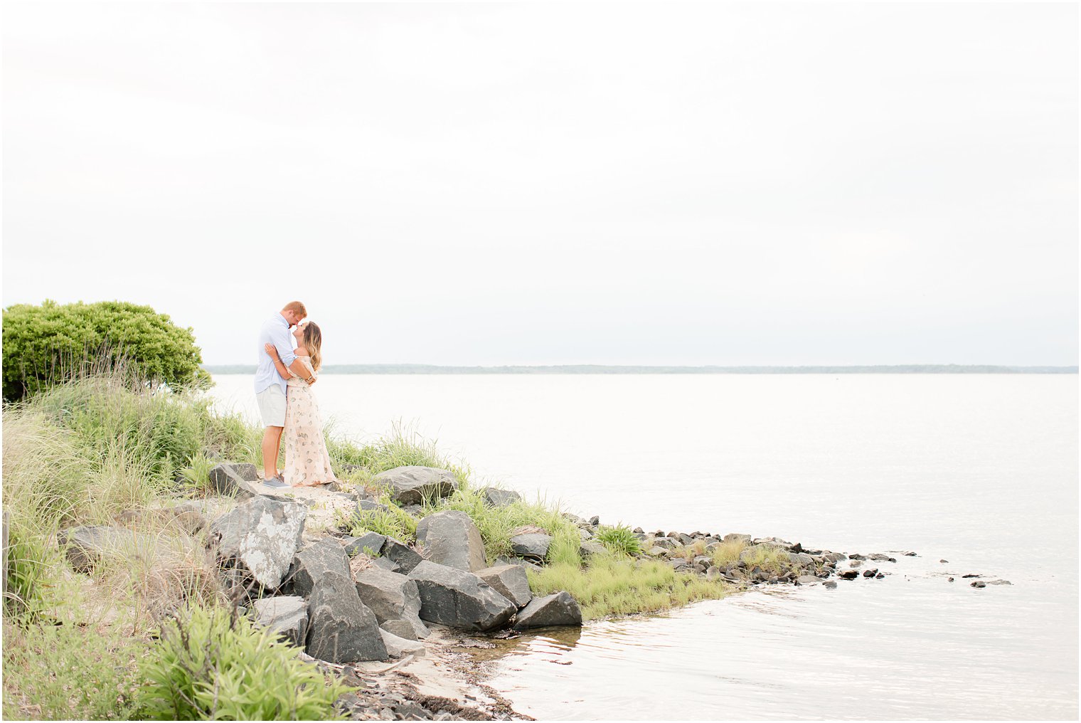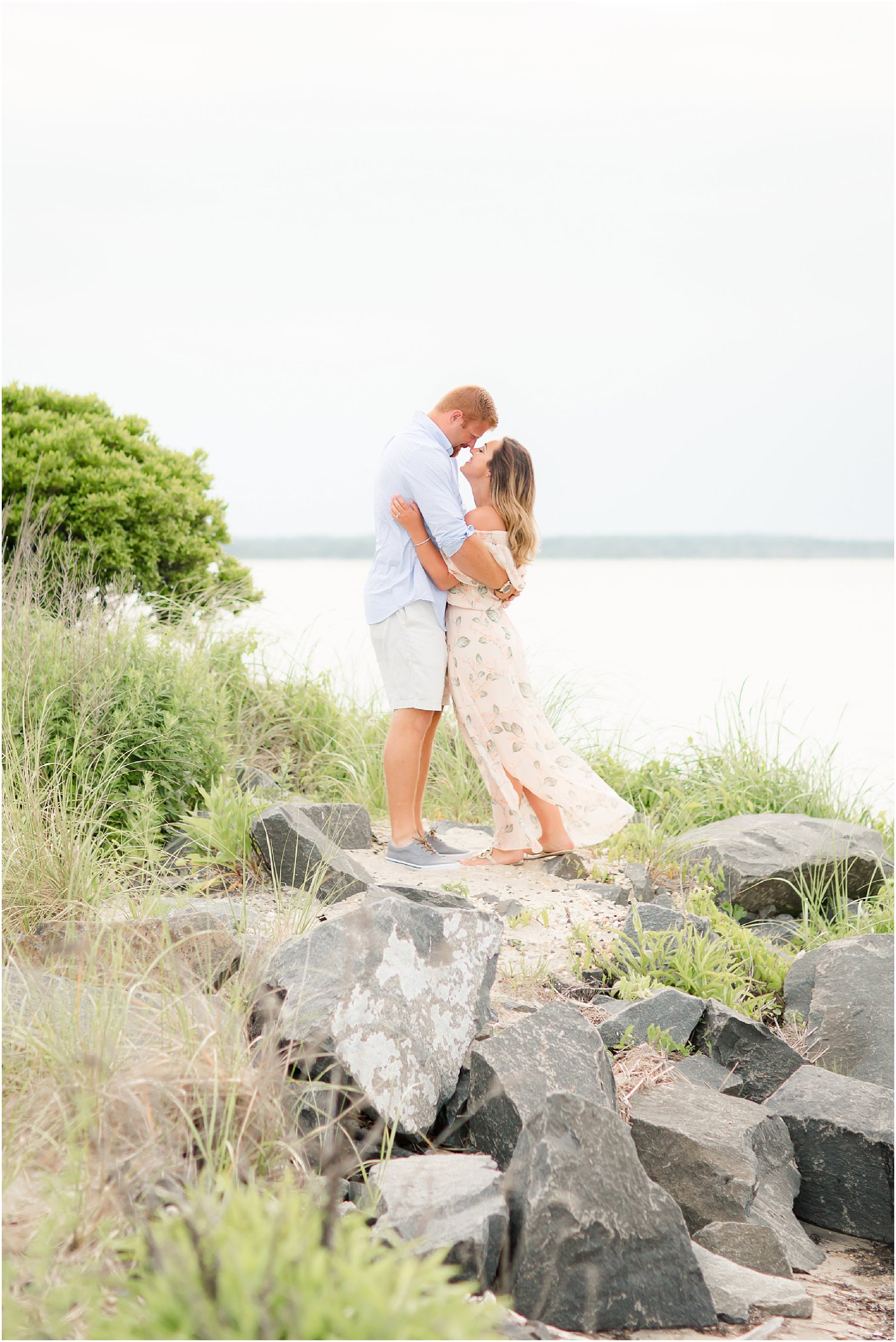 I met up with Catherine and Gage last summer in Lavallette. Catherine and Gage are huge fans of being near the water and boating, too, so they wanted to incorporate as many typical summer scenes as possible during their shoot. We met up in Lavallette at Jacobsen Park and had the prettiest light. I loved how their soft peach and blue color palette looked against the peaceful blue landscapes of the cove but even more, I love the views of the water, the tall grasses, the boats, and even some dramatic rocks on the seashore that they were able to climb on for some romantic portraits.